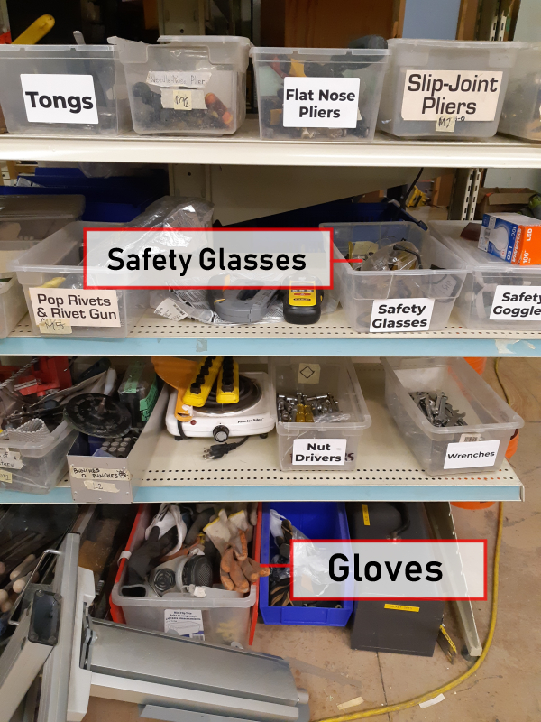 Most safety glasses are located in a bin in the small tools section