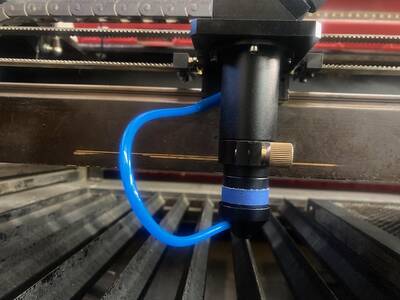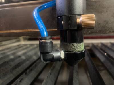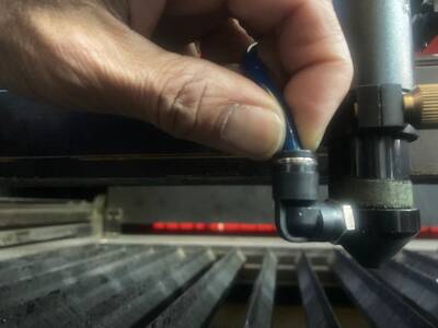 Lenses are installed in the head assembly by sliding them into the lower tube and securing by snuggly tightening the lower knob and then attaching the blue air assist tube to the lens. Below is that head assembly and air assist tube without a lens installed.