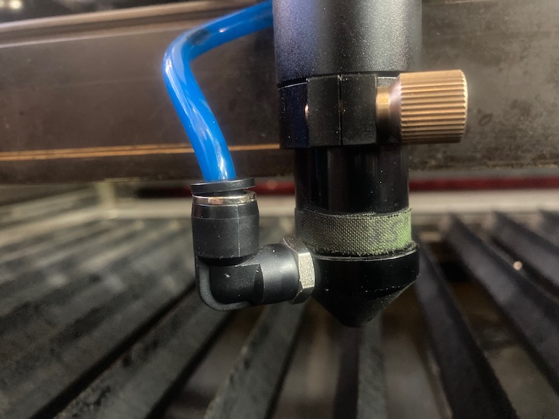 The laser engraving lens has a smaller diameter tube that is permanently attached to the lens. Just slide this inside the larger diameter air assist hose.