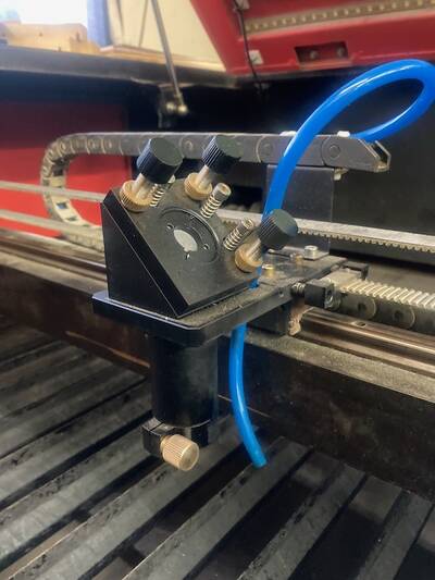 - Inspect the laser lens by looking through the end of the tube. If the lens appears dirty then please alert the Laser Cutter Committee so that they may perform laser lens maintenance. Do not use a dirty lens as this will cause dirt to be baked onto the lens and permanently damage it.
