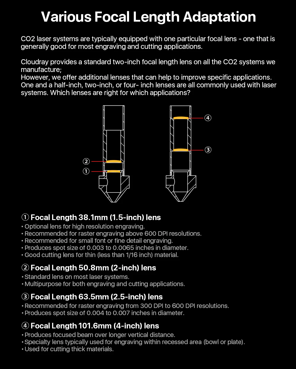 This lens is used for cutting thick materials from ⅜” up to ¾” plywood/softwood and perhaps up to ½” hardwood or engraving into deep recessed pockets.