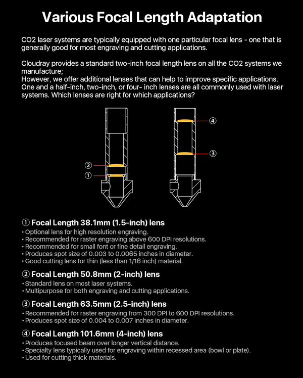 This lens is used for fine detail photo engraving. This lens when properly focused and using proper speed and power settings should be capable of producing 0.1mm dots.