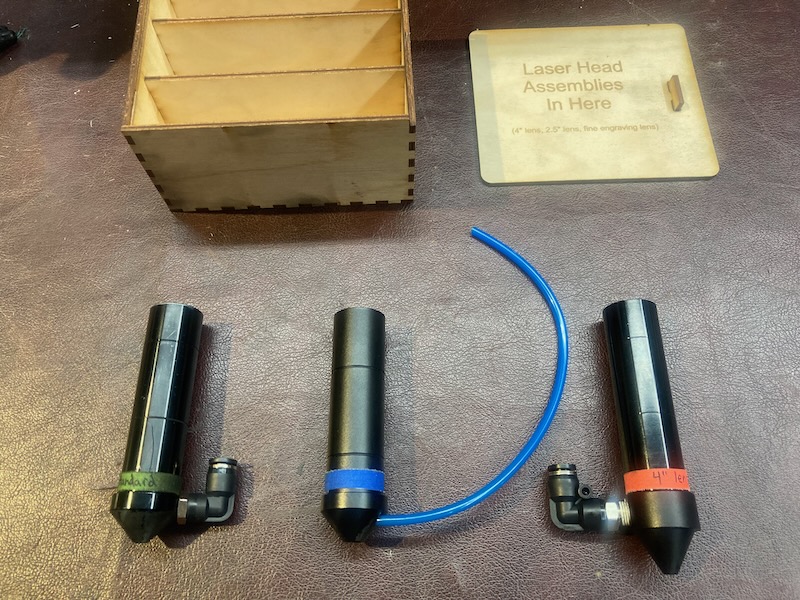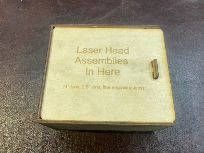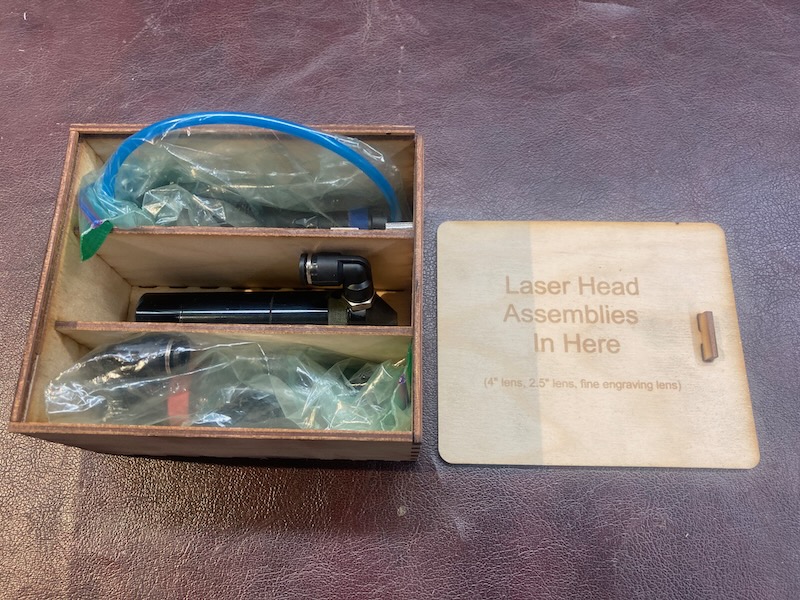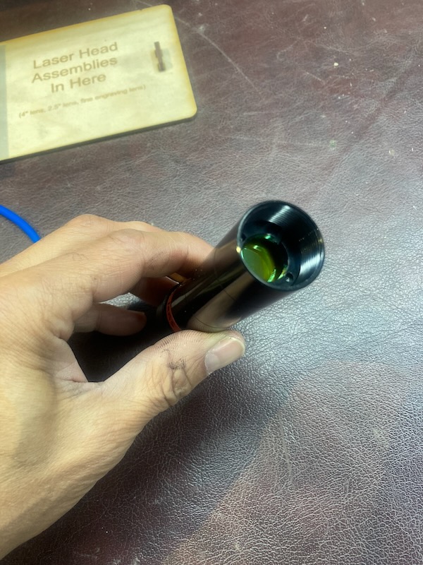 - Ensure that the 2.5 inch standard(green tape) lens is left on the laser cutter for the next person. Return the 4 inch (orange tape) or compound engraving lens (blue tape) to the lens storage box.