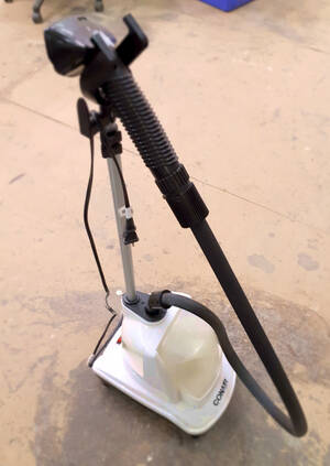 The steamer is for loosening wrinkles out of fabric, and possibly making longbows, who knows. To get started, empty the old water from the tank and put new water in. You do NOT need to fill it up to full. Halfway is more than enough for even large projects. The jug has a no-spill cap on it, so you can tip it upside down and place it in the holster. Plug in, turn on.