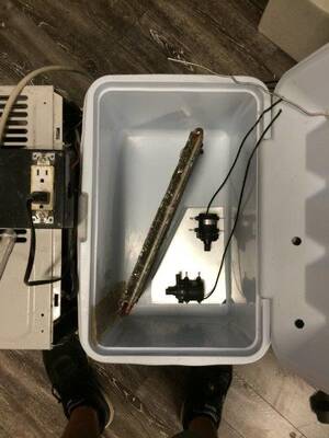 An AC unit water chiller was fabricated to replace the CW-3000 and provide consistent water temperatures year round. The AC unit was a 5000 BTU (1800W cooling power) air conditioner purchased on craigslist for $20. The evaporator (cold) side of the AC unit was relocated to the interior of an insulated chest cooler and the holes made in the cooler were sealed with expanding foam and silicone sealant. A temperature controller was then installed to turn the AC unit on / off based on the water temperature in the cooler. The water in the chest cooler is then pumped through the laser cutter tube using a submersible pump. A second submersible pump keeps the water moving in the chest cooler (it could be argued that this pump is not needed, but in times of heavy use, this keeps the evaporator coil from icing up)
