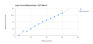 A test pattern was created with 12 parallel lines, 80 mm long. Each line was set to a speed of 20 mm/s and increasing power levels from 5% to 60% in 5% increments. The cut was initiated and the current was recorded by hand from the current meter. The laser cutter file was saved in the Laser stuff folder.