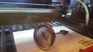 The power meter was prepared by using the included wrench to set the power to zero using the nut on the rear of the gauge. The focus lens was removed from the laser assembly and the power meter mass was positioned under the unfocused beam. The laser was set to a power of 60% and manually fired for a total of 21 seconds using a stopwatch.