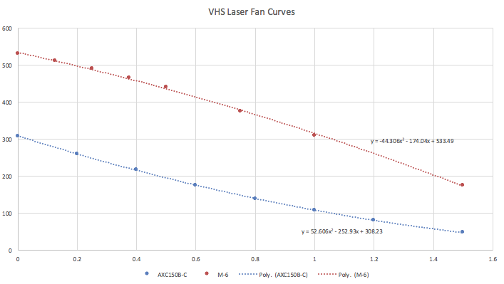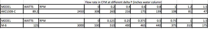 For an 80W CO2 laser such as that of VHS, the suggested minimum flow rate is 250cfm. In order to meet these requirements, a target setpoint of 350cfm was used. To meet this spec, two axial fans original designed for hydroponic applications were investigated. The fan curves are below:
