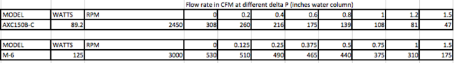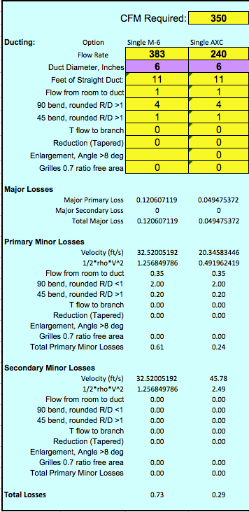 Given the 6' ducting, and required filters, the major and minor Dp's were calculated and compared to the available fan curves. This determined that the optimum setup was a single M6 fan with minimal other backpressure as seen below: