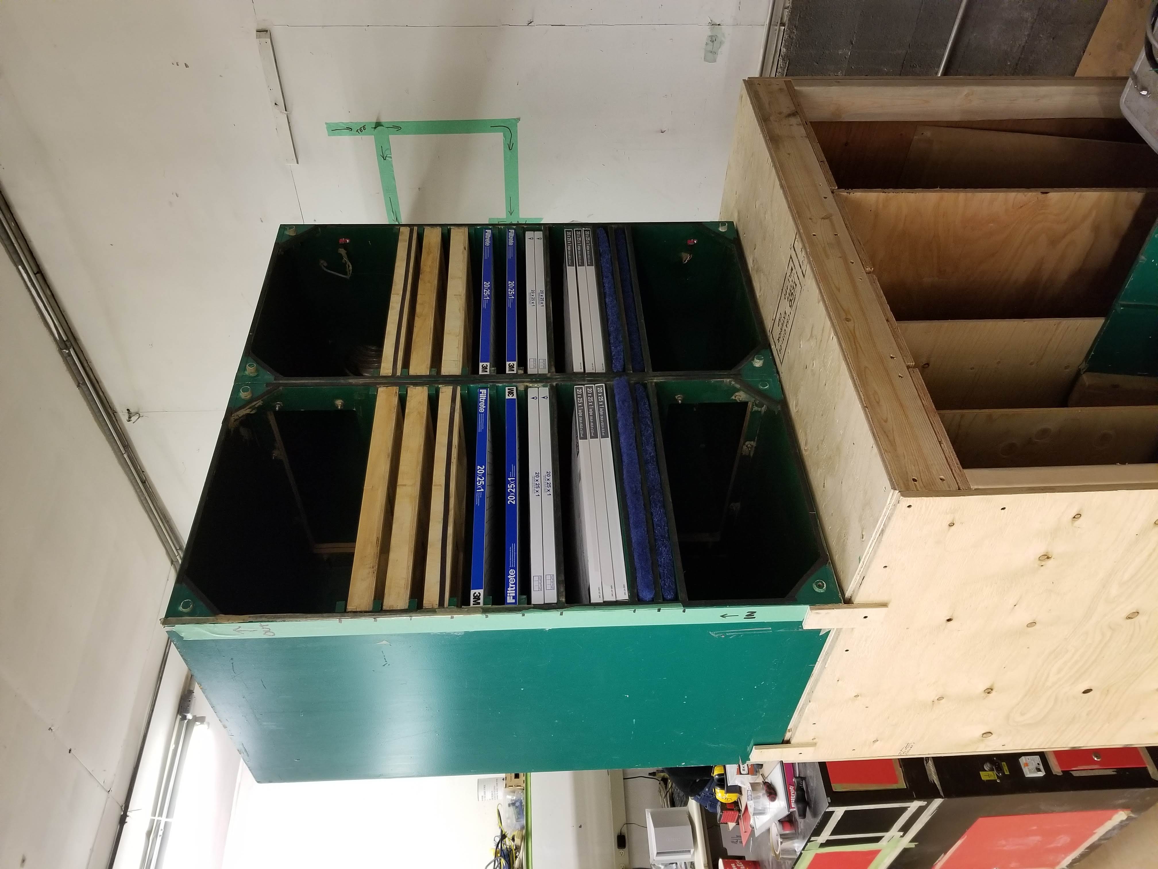 Deposit area Vacuum thoroughly and wipe down with water and a damp rag. Washable Pre-Filter Hand wash in the large sink, and then shake excess water off before hanging to dry. When reinstalling the prefilters, care should be taken to ensure they are fully supported and sitting flat on the filter box frame as they tend to get snagged during installation. Furnace Filters Each filter should be vacuumed and inspected during each maintenance interval. While there are no specific change intervals, once a filter becomes clogged with debris it should be replaced. Current experience is that the filter media shouldn’t need to be replaced any more frequently than once every 3-6 months, but this will be highly dependent on usage. In each set of filters, it is recommended to replace the lower filter first, and add the new filter to the top of the stack. Repeat for each bank of MERV 8, 10 & 13 filters. Activated carbon trays (top three) are not a part of this basic maintenance procedure and can be left alone.