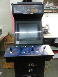 The MAME machine bones are from a 4 player Blitz 99 game. The original monitor has been replaced with a flat screen. There is a PC in the back. The buttons are controlled through an Ipac 4 to USB to PC. The audio comes from the headphones jack in the RPi and runs into a small amp, which is wired to the speakers in the marquee.