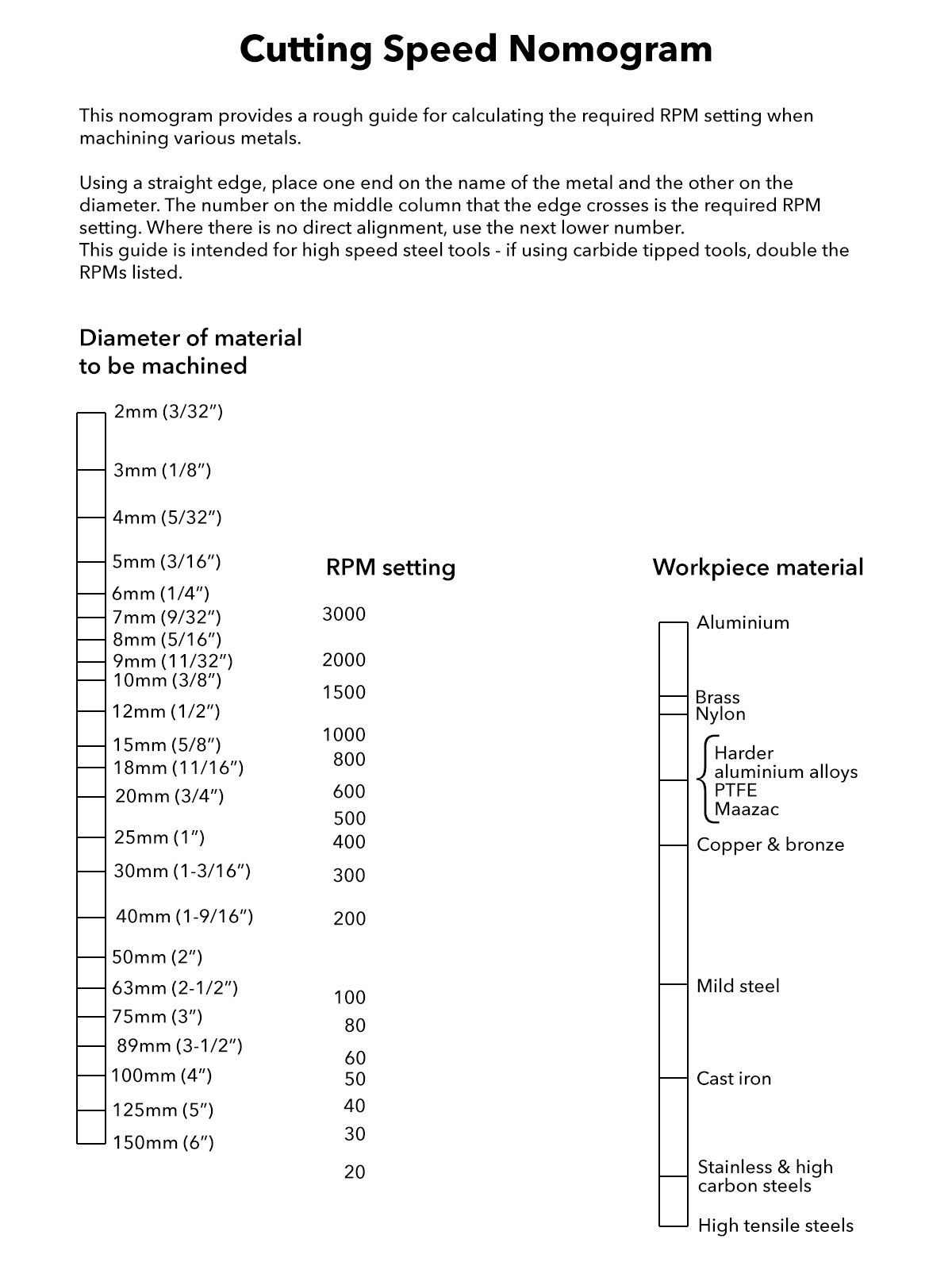Cutting speeds can be determined easily by using this cutting speed nomogram. The original cutting speed nomogram came from Ian at the BCSME.