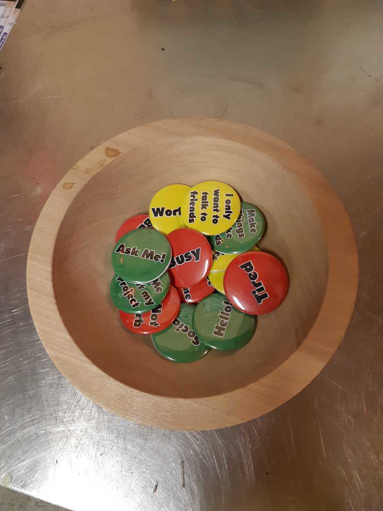 Yellow buttons show that you advice caution when approaching. A person with a yellow button may be busy with a project, trying to concentrate, or just tired. They may want to have limited interaction, or only want to speak to a few people instead of having strangers approach them.